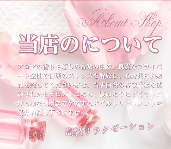 アクセス抜群に新感覚リラクゼーションが誕生★若くて可愛いセラピストを厳選して採用し、お客様の満足を叶えるお店!大人の癒しリラクゼーションマッサージ。当店では高級感ある落ち着いた店内と自信をもってオススメするセラピストが貴方の疲れをしっかりとそして優しく癒します。是非、一度体験してみてください。そしてひとときをお楽しみください。